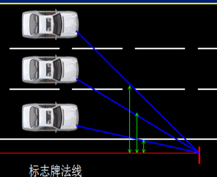 再比如,当行驶在多车道的道路上观察路侧标志时,行驶在内侧车道时的入射角比行驶在外侧车道的入射角大,如下图4所示: